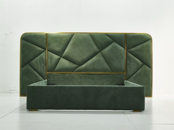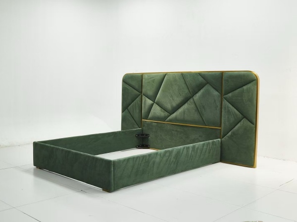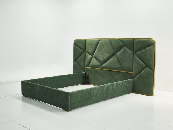 This king bed frame with headboard is a stunning centerpiece for any bedroom, seamlessly blending opulence and functionality. The headboard, adorned with an intricate geometric pattern, immediately draws the eye. Crafted from plush, velvet-like fabric in a rich emerald green hue, it exudes luxury and sophistication. The meticulous stitching and diamond – shaped tufting add depth and texture, elevating the overall aesthetic to a level of high – end design.