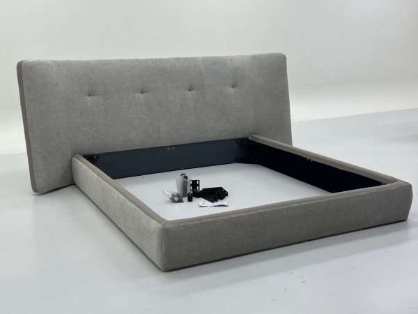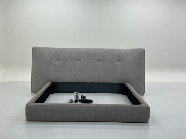 Moreover, the bed frame comes with necessary hardware components, neatly positioned on the bed base, signifying that it is prepared for assembly. The overall design not only emphasizes aesthetic charm but also focuses on providing a comfortable and functional sleeping experience. Whether serving as a focal point in a master bedroom or a stylish addition to a guest room, this upholstered bed frame is bound to elevate the atmosphere of any sleeping space.