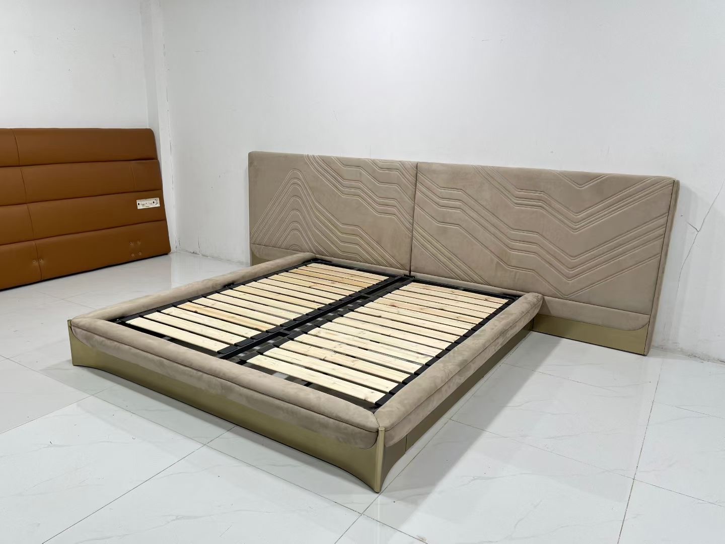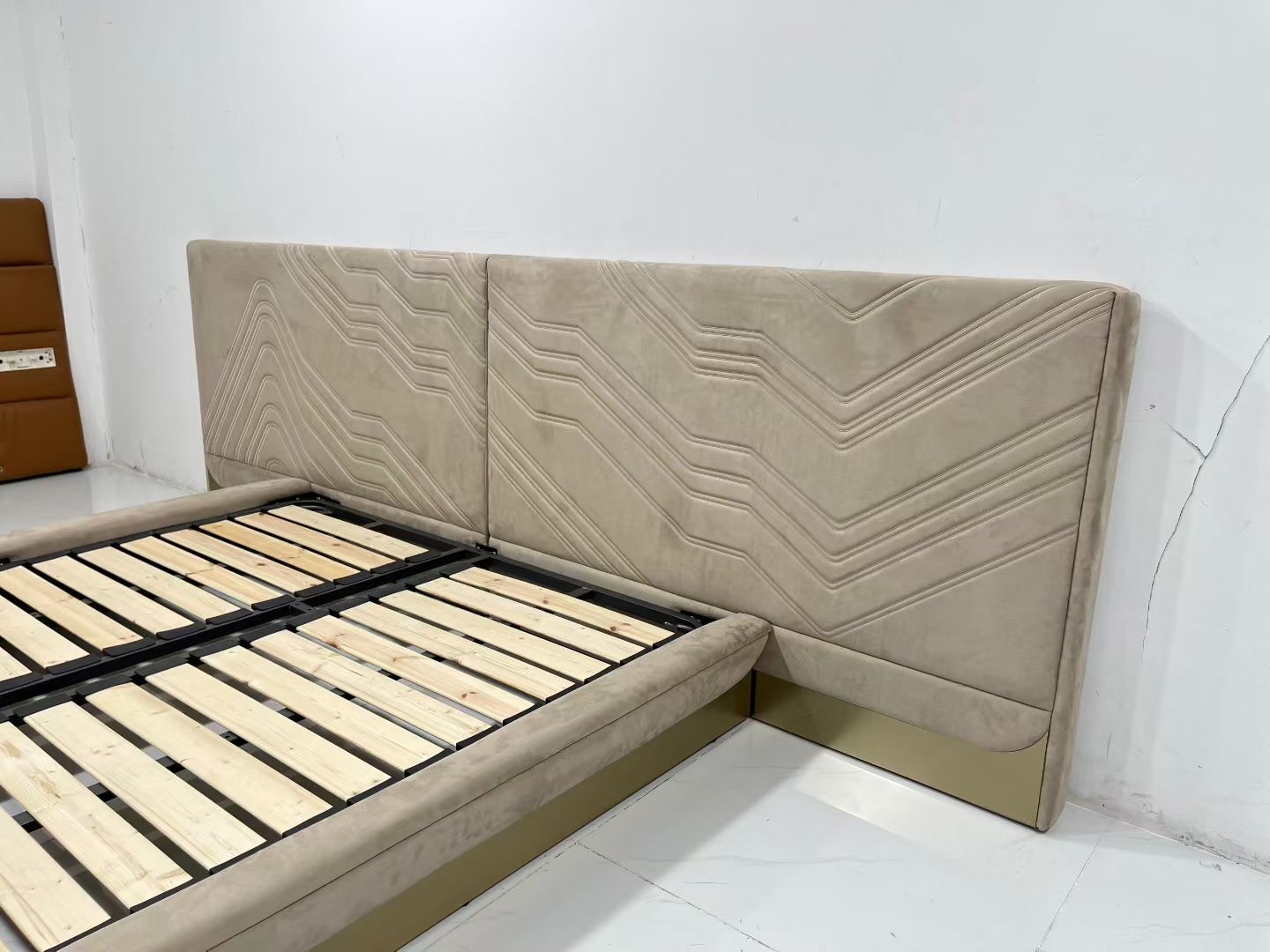 A queen bed, consisting of a queen bed frame and headboard, is presented. The headboard is upholstered in a light beige fabric with an eye – catching, wavy texture, which adds a touch of sophistication to the overall design. It stands tall and serves as a stylish element, enhancing the aesthetic appeal of the bed.